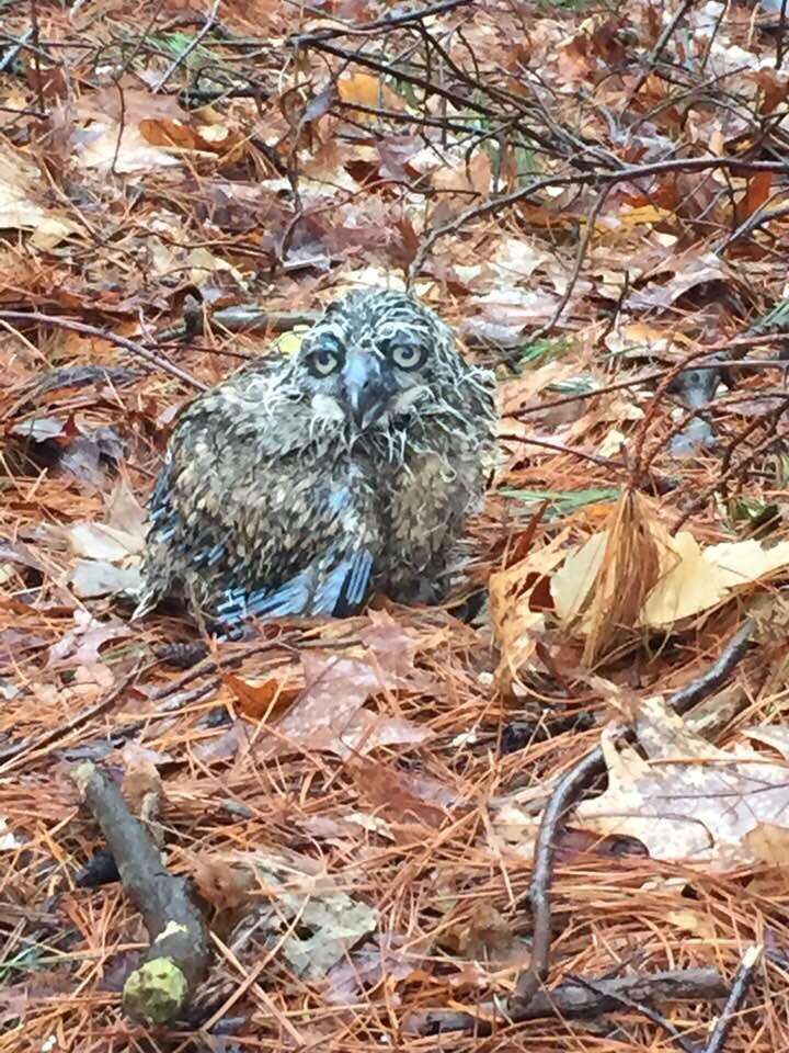 This week, someone walking their dog through a park in Longmeadow, Massachusetts, happened upon a very sad and sorry sight. There, rain-soaked and shivering on the ground, was a stranded baby great horned owl.